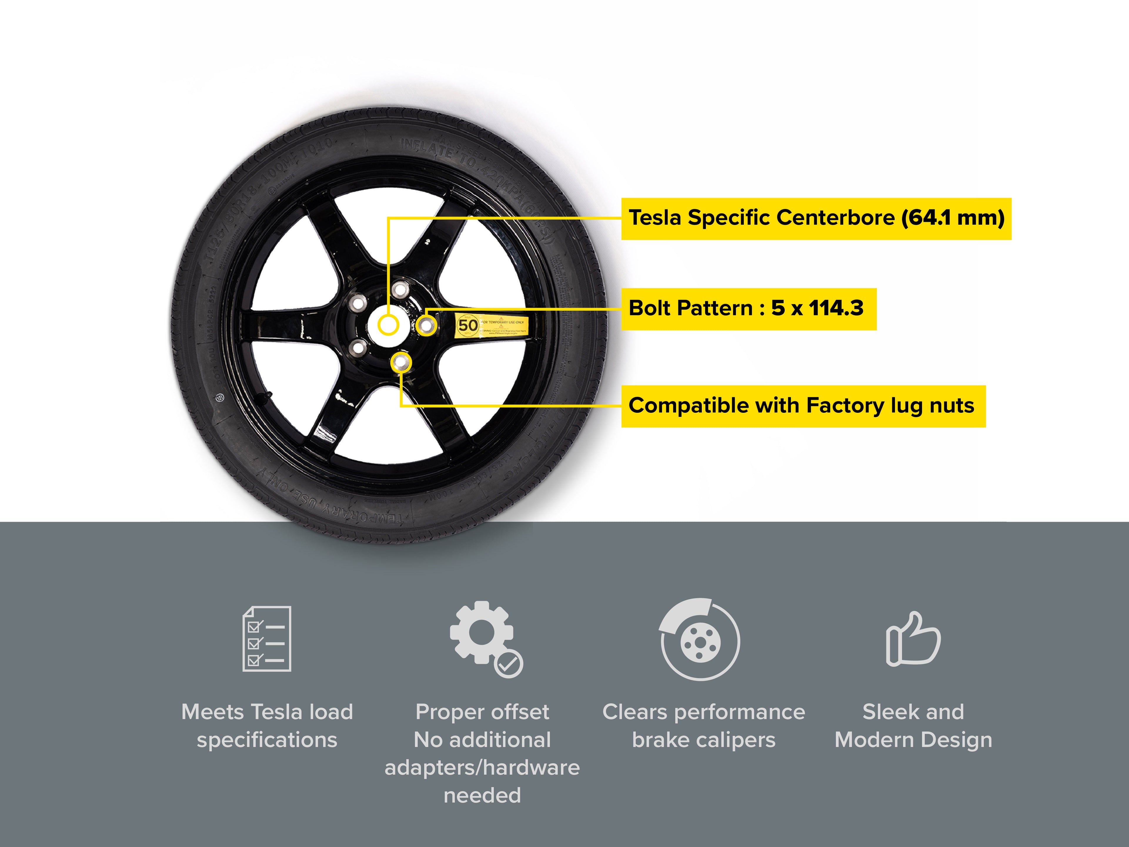 StanceMagic Compact Spare Wheel and Tire Kit For Tesla. Includes Wheel, Compact Spare Tire, Scissor Jack, Socket Wrench, and Storage Bag Carrying Case Complete Kit.