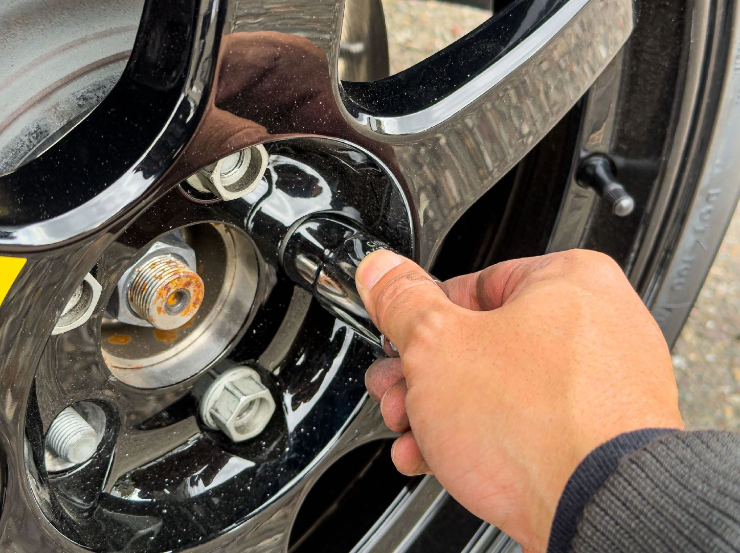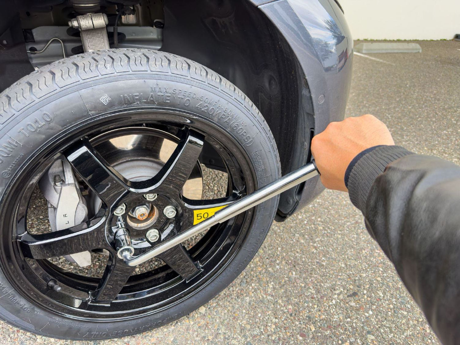 3. Before fully lifting the vehicle with the jack, you will need to loosen the wheel lug nuts. Start by removing the lug nut covers (if applicable) and begin by using the breaker bar to “break” the tension for each lug nut (DO NOT remove lug nut)