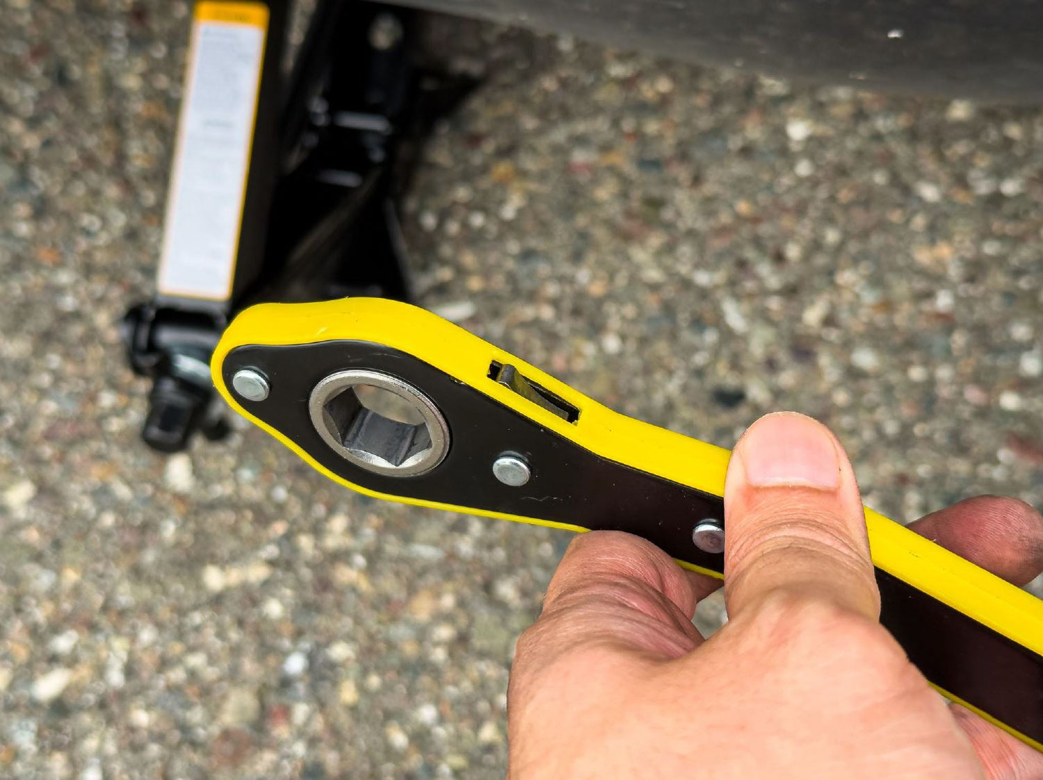 2. Use the included socket wrench to begin extending the jack, double checking to make sure the jack lines up with the opening as it gets extended.
